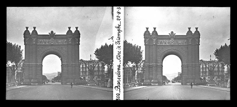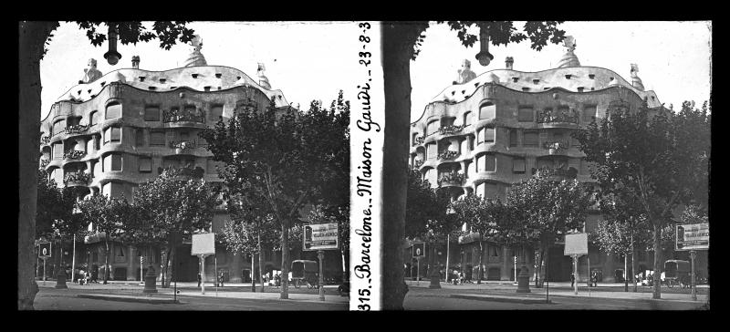 En effet, il y a quelques mois, la Stéréothèque a intégré dans la collection Caillol un reportage touristique sur la cité catalane réalisé en août 1933, en deux lots de photos (CLL333 à CLL340 et CLL431 à CLL440) qui présentent une orientation très spécifique : alors qu’en général un touriste s’intéressera en priorité aux édifices les plus anciens, dont Barcelone ne manque pas, ces 18 photos sont presque exclusivement consacrées à des bâtiments construits entre 1831 et 1929. Le photographe, manifestement intéressé par les dernières tendances de l‘architecture, nous livre un reportage sur ce qu’il faut désigner, en 1933, comme de l’architecture contemporaine.