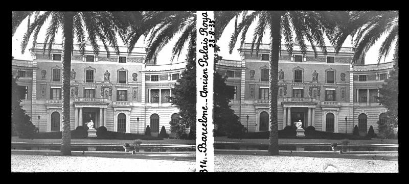 En s’éloignant nettement du centre en direction de l’ouest, si l’on prend l’Avenida Diagonal (un axe volontairement pensé par Cerdà, coupant en diagonale son plan orthogonal, pour relier l’est et l’ouest de la ville), on parvient dans le quartier de Pedralbes, qui était, avant l’extension de Barcelone, un village distinct. Ce palais, inspiré des palais italiens, fut construit entre 1919 et 1926 par les architectes Francesc de Paula Nebot et Eusebi Bona, pour servir de résidence au roi Alphonse XIII. Nous avons là le seul exemple d’un néoclassique Renaissance de notre circuit. Devenu propriété de la ville lors de l’avènement de la République, il était, au moment de la visite de notre photographe, le musée des Arts décoratifs de la ville (situation qui ne fut qu’éphémère, de 1932 à 1937).