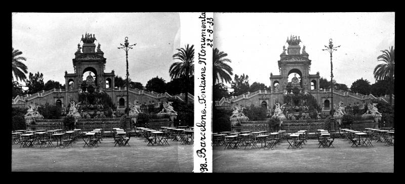 De l’immeuble ci-dessus, il suffit de continuer l’avenue de quelques centaines de mètres pour arriver au Parc de la Citadelle. Ce parc public a été créé à la suite de la démolition de la Citadelle après 1868, forteresse construite un siècle et demi plus tôt par le pouvoir royal pour surveiller les habitants de la ville ; elle concentrait donc toute l’hostilité des Barcelonais. On profita de l’existence de ce parc pour y installer en 1888 l’Exposition universelle. En 1933, il reste quelques témoins de cette manifestation, toujours présents aujourd’hui : notamment l’ancien restaurant de l’Exposition, dit Château des Trois Dragons, dont nous ne possédons pas de photo de notre photographe, et la fontaine monumentale, construite juste avant l’Exposition universelle par l’architecte Josep Fontseré, avec la participation du jeune Gaudi, encore étudiant en architecture.