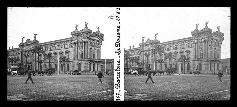 Au débouché de la via Laietana, en face de la rade, en lisière du quartier de La Barceloneta, ce bâtiment, très aimé des Barcelonais, a été construit en 1926 par les architectes Josep Goday et Jaume Torres i Grau sur des plans conçus dès 1914. Il est inscrit à l’inventaire du patrimoine culturel catalan. C’est un exemple du style néoclassique développé sous l’influence de l’École des Beaux-Arts de Barcelone, d’ailleurs très en vogue dans toute l’Europe : nous avons ici une évocation des façades gréco-romaines, avec péristyle et colonnes ioniques. En 1933, cet édifice n’a que 6 ou 7 ans : le « dernier cri » de l’architecture pour notre photographe !